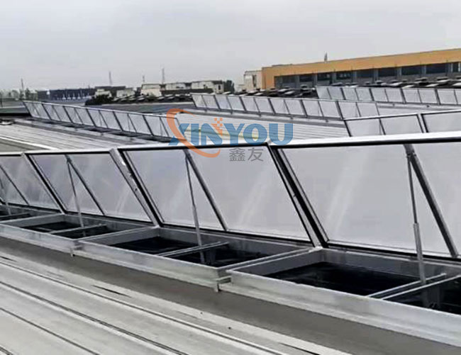鑫友工業類電動消防排煙天窗主要適用于廠房等工業類大型建筑的屋頂采光、通風、排煙,設計依據建筑標準設計圖集09J621-2。